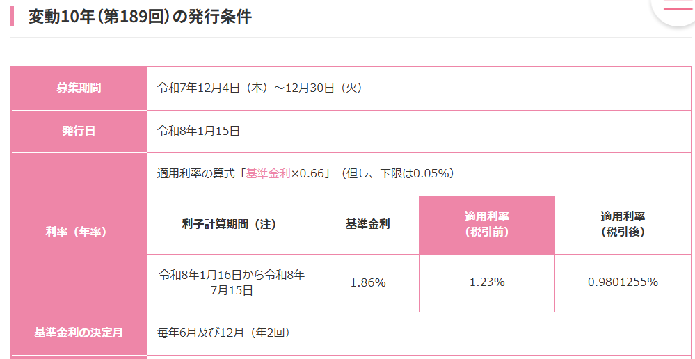 個人向け国債「変動10年」第189回(1.23%、税引後0.98%):約9,801円