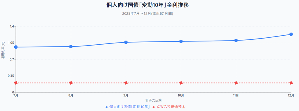 個人向け国債「変動10年」の金利は、過去6カ月間で0.96%から1.23%へと着実に上昇しています。銀行の普通預金と比較すると、100万円あたり年間約9,700円以上も多く利息を受け取れる計算です。
