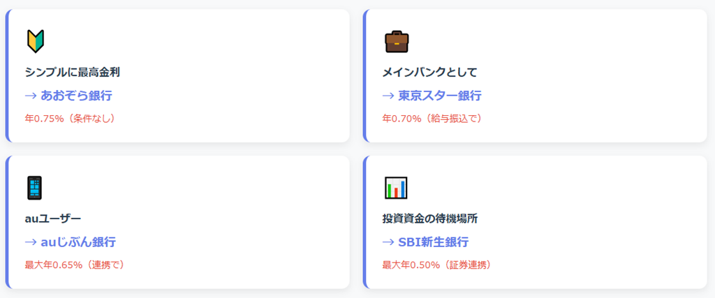 • 条件なしで高金利ならあおぞら銀行、メインバンクなら東京スター銀行 – 自分のライフスタイルに合わせて選択