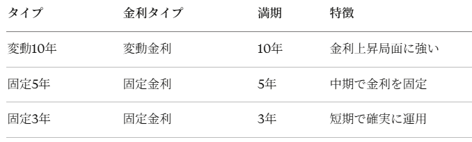 変動金利型の場合、今後金利が低下すれば受け取る利息も減少します。ただし、最低金利0.05%の保証があるため、極端に低くなることはありません。