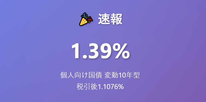 個人向け国債変動10年型(金利1.39%、税引後1.1076215%)